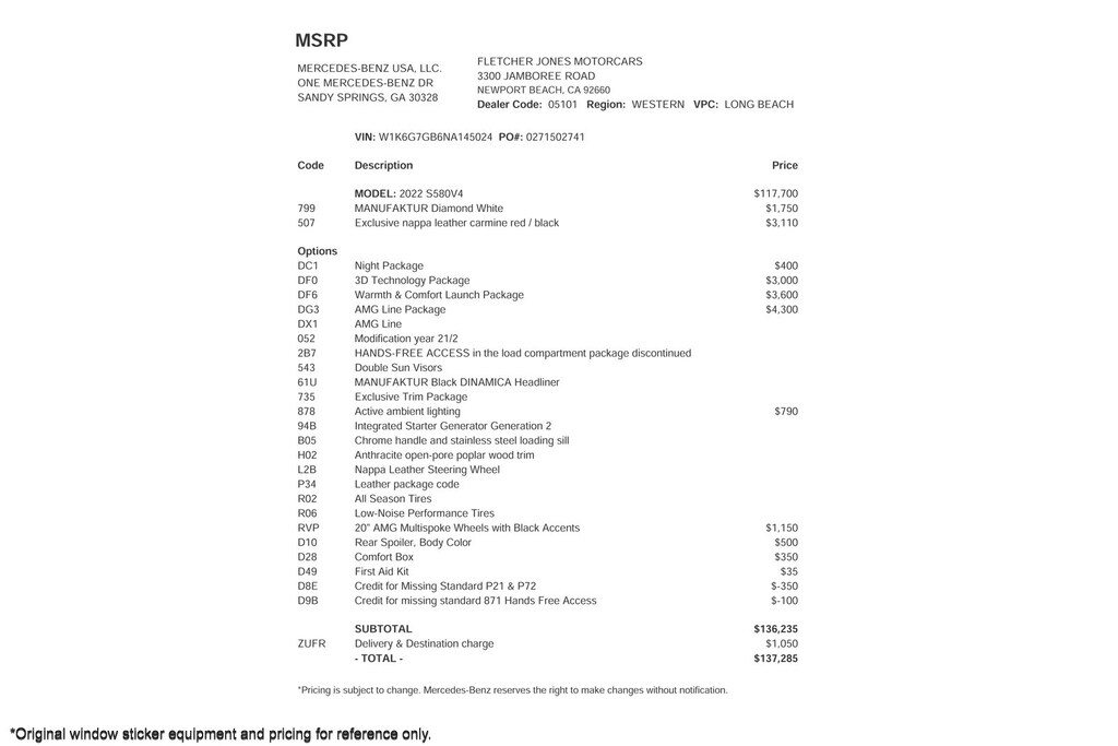 Fletcher Jones Motorcars, the nation’s #1 certified pre-owned Mercedes-Benz sales center, presents this 2022 Mercedes-Benz S 580 4MATIC Sedan. This Mercedes-Benz has 47,295 miles and comes in a Manufaktur Diamond White on Carmine Red/Black color combination. Live out of the area? Contact us to discuss convenient delivery options. (949) 718-3000