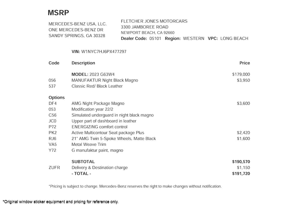 Fletcher Jones Motorcars, the nation’s #1 certified pre-owned Mercedes-Benz sales center, presents this 2023 Mercedes-Benz AMG G 63 4MATIC SUV. This Mercedes-Benz has 11,660 miles and comes in a Manufaktur Night Black Magno on Classic Red/Black color combination. Live out of the area? Contact us to discuss convenient delivery options. (949) 718-3000
