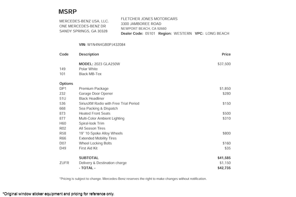 Fletcher Jones Motorcars, the nation’s #1 certified pre-owned Mercedes-Benz sales center, presents this 2023 Mercedes-Benz GLA 250 SUV. This Mercedes-Benz has 19,379 miles and comes in a Polar White on Black color combination. Live out of the area? Contact us to discuss convenient delivery options. (949) 718-3000