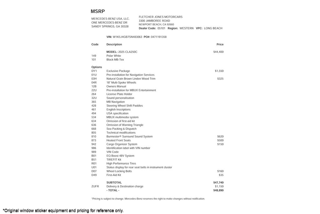 Lease specials available on this CLA! Fletcher Jones Motorcars, the nation’s #1 certified pre-owned Mercedes-Benz sales center, presents this 2025 Mercedes-Benz CLA 250 Coupe. Only 6,879 miles on this courtesy service loaner! This is a rare opportunity to purchase an ultra-low mileage, well upgraded, Mercedes-Benz at a tremendous savings. This excellent condition CLA 250 Coupe comes in a stunning Polar White on Black color combination. If we can assist you with any questions, or to schedule a test drive, please contact us at (949) 718-3000