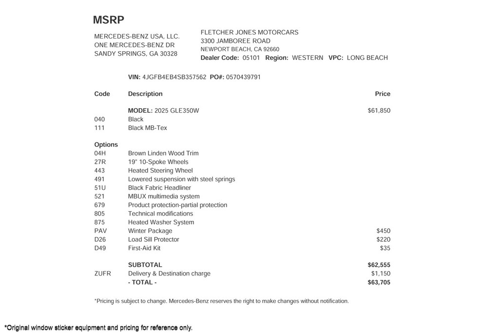 Lease specials available on this GLE! Fletcher Jones Motorcars, the nation’s #1 certified pre-owned Mercedes-Benz sales center, presents this 2025 Mercedes-Benz GLE 350 SUV. Only 9,653 miles on this courtesy service loaner! This is a rare opportunity to purchase an ultra-low mileage, well upgraded, Mercedes-Benz at a tremendous savings. This excellent condition GLE 350 SUV comes in a stunning Black on Black color combination. If we can assist you with any questions, or to schedule a test drive, please contact us at (949) 718-3000