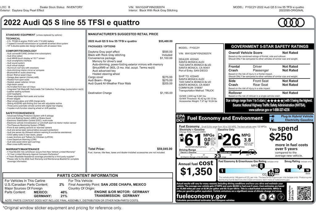Audi Fletcher Jones presents this 2022 Audi Q5 S line Premium 55 TFSI e quattro. This Audi has 26,539 miles and comes in a Daytona Gray Pearl Effect on Black color combination. Live out of the area? Contact us to discuss convenient delivery options. (949) 791-1500