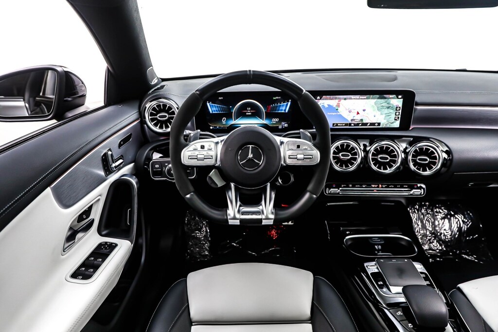 UPGRADED EQUIPMENT: Multimedia Package, AMG Night Package, AMG Aerodynamic Package, Premium Package, Blind Spot Assist, Head-up Display, AMG Sport Suspension, MBUX HeadUnit High, Burmester Surround Sound System, Heated Front Seats, Aluminum Linear Grain Trim, Engine Service Interval, AMG Performance Steering Wheel in Nappa Leather / DINAMICA, 19" AMG Multi-Spoke Wheels, Matte Black, Black Seatbelts, AMG Drive Unit Steering Wheel Buttons