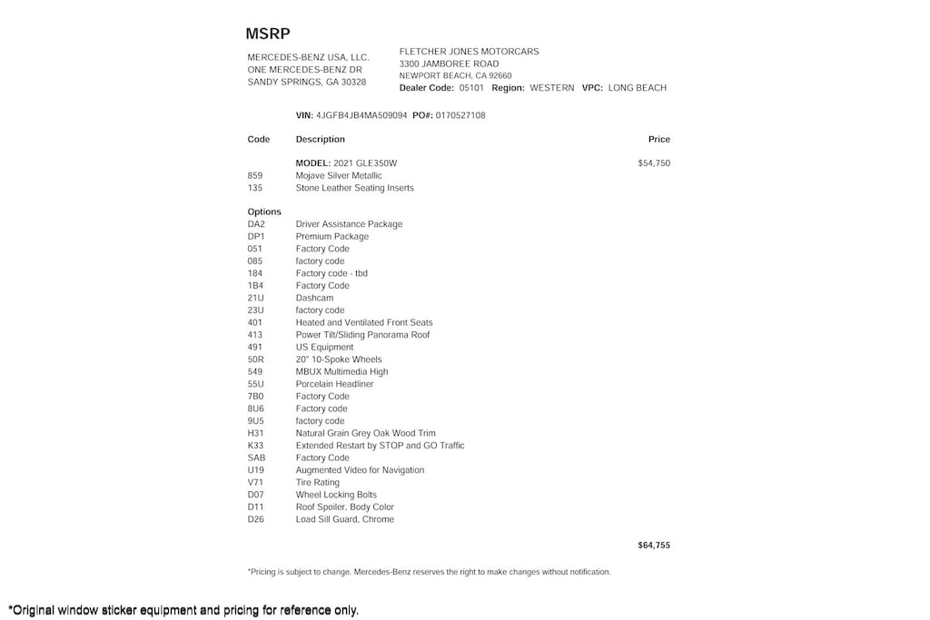 UPGRADED EQUIPMENT: Driver Assistance Package, Premium Package, Dashcam, Heated and Ventilated Front Seats, Power Tilt/Sliding Panorama Roof, 20" 10-Spoke Wheels, MBUX Multimedia High, Porcelain Headliner, Natural Grain Grey Oak Wood Trim, Extended Restart by STOP and GO Traffic, Roof Spoiler, Body Color, Load Sill Guard, Chrome