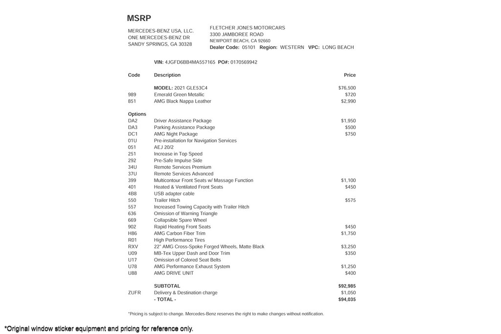 UPGRADED EQUIPMENT: Driver Assistance Package, Parking Assistance Package, AMG Night Package, Pre-Safe Impulse Side, Remote Services Advanced, Multicontour Front Seats w/ Massage Function, Heated & Ventilated Front Seats, Trailer Hitch, Increased Towing Capacity with Trailer Hitch, Rapid Heating Front Seats, AMG Carbon Fiber Trim, 22" AMG Cross-Spoke Forged Wheels, Matte Black, MB-Tex Upper Dash and Door Trim, AMG Performance Exhaust System