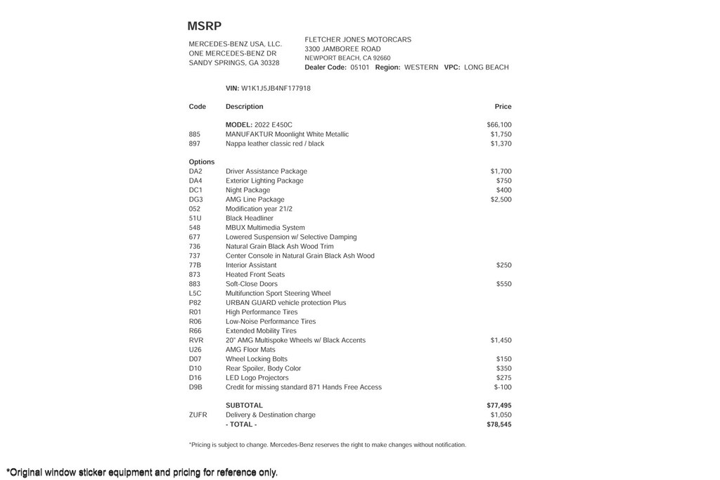 Fletcher Jones Motorcars, the nation’s #1 certified pre-owned Mercedes-Benz sales center, presents this 2022 Mercedes-Benz E-Class E 450 RWD Coupe. This Mercedes-Benz has 40,640 miles and comes in a Manufaktur Moonlight White on Classic Red/Black color combination. Live out of the area? Contact us to discuss convenient delivery options. (949) 718-3000