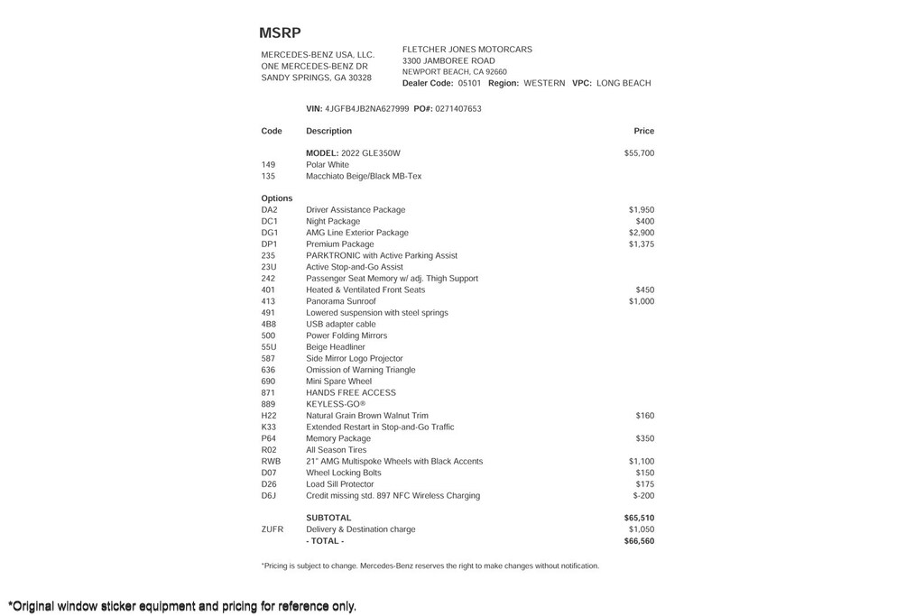 UPGRADED EQUIPMENT: Driver Assistance Package, Night Package, AMG Line Exterior Package, Premium Package, PARKTRONIC with Active Parking Assist, Active Stop-and-Go Assist, Passenger Seat Memory w/ adj. Thigh Support, Heated & Ventilated Front Seats, Panorama Sunroof, lowered suspension with steel springs, Power Folding Mirrors, Beige Headliner, Side Mirror Logo Projector, Natural Grain Brown Walnut Trim, Extended Restart in Stop-and-Go Traffic, Memory Package, 21" AMG Multispoke Wheels with Black Accents, Load Sill Protector