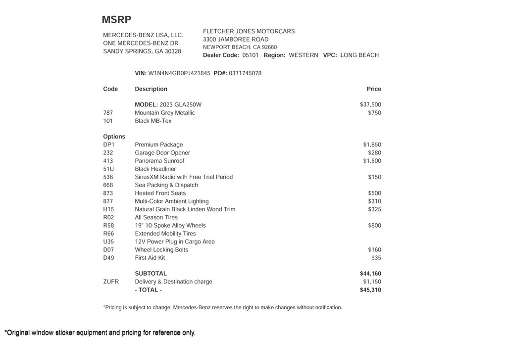 Fletcher Jones Motorcars, the nation’s #1 certified pre-owned Mercedes-Benz sales center, presents this 2023 Mercedes-Benz GLA GLA 250 SUV. This Mercedes-Benz has 38,161 miles and comes in a Mountain Grey Metallic on Black color combination. Live out of the area? Contact us to discuss convenient delivery options. (949) 718-3000