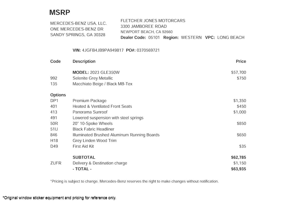Fletcher Jones Motorcars, the nation’s #1 certified pre-owned Mercedes-Benz sales center, presents this 2023 Mercedes-Benz GLE GLE 350 SUV. This Mercedes-Benz has 18,027 miles and comes in a Selenite Grey Metallic on Macchiato/Black color combination. Live out of the area? Contact us to discuss convenient delivery options. (949) 718-3000