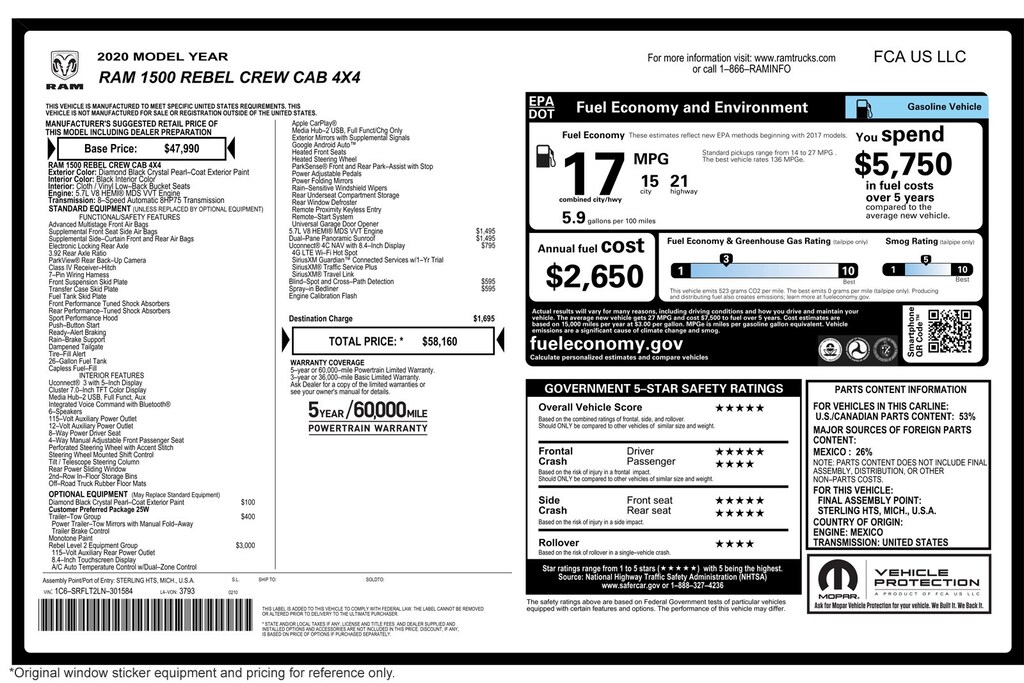 UPGRADED EQUIPMENT: Customer Preferred Package 25W, Trailer Tow Group, Rebel Level 2 Equipment Group, 5.7L V8 HEMI® MDS VVT Engine, Dual–Pane Panoramic Sunroof, Uconnect® 4C NAV with 8.4–Inch Display, Blind–Spot and Cross–Path Detection, Spray - In Bedliner